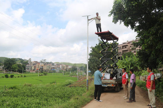 横州市局结合到平马社区三叉村察看街灯装配情况。梁秋丽摄