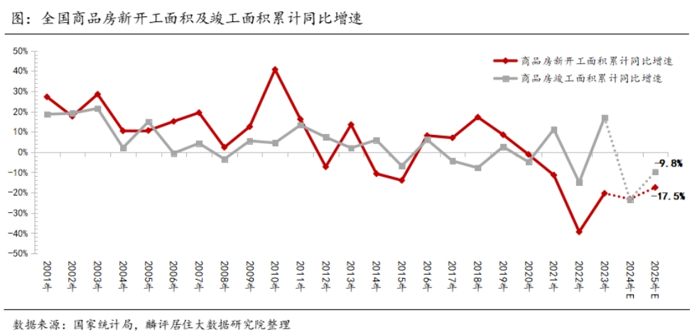 受地皮缩量、房企资金承压、市集库存范围高级身分制约,2024年以来商品房新开工面积捏续下滑态势,把柄国度统计局数据显现,2024年1-11月,房屋新开工面积67308.44万 ,同比下跌23%。新开工能源不及,重复2023年多数保交楼寄托,短期基数擢升,兑现端也在承压下行,2024年1-11月,房屋兑现面积48151.71万 ,下跌26.2%。琢磨在行业去库存的主基调下,2025年新开工面积将连续回落,降幅在17.5%左右;同期在施工范围连续回落的压力下,2025年兑现面积也有可能看护下行态势,降幅或收窄至9.8%。