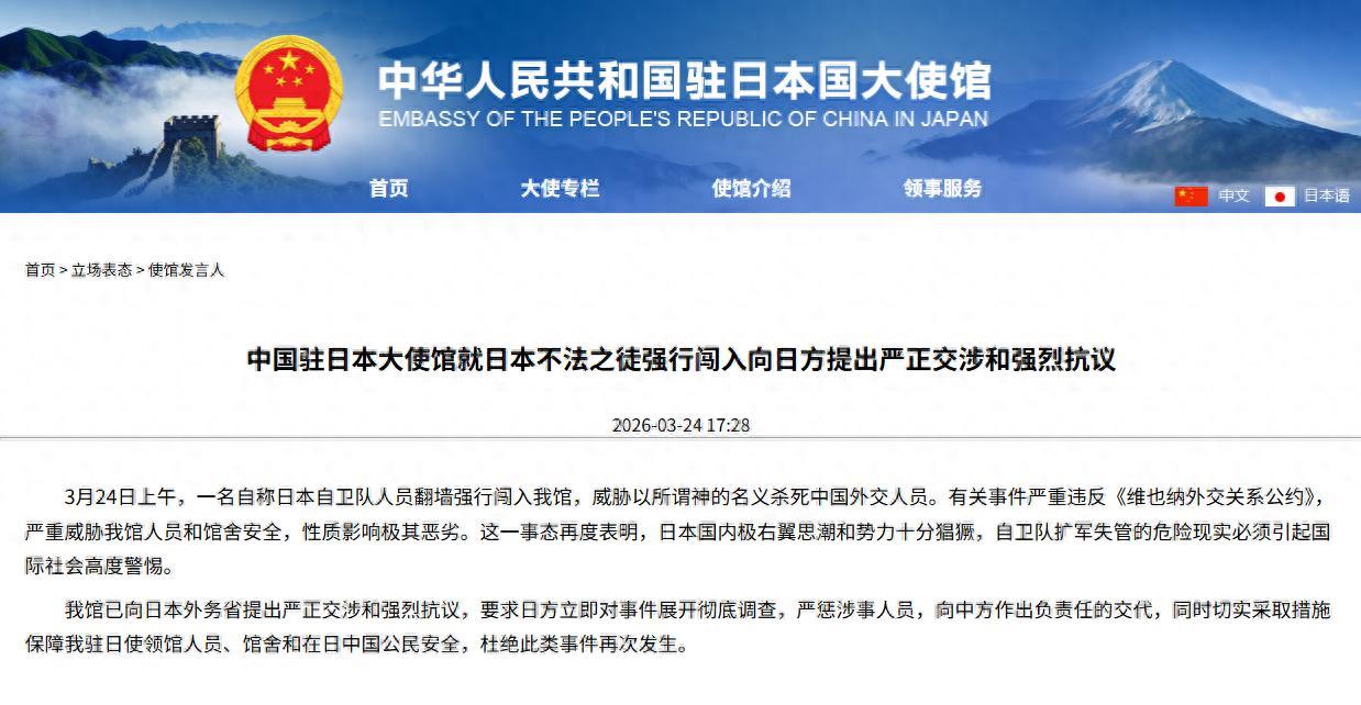 在3月24日的酬酢部例行记者会上,发言东谈主林剑证据,今日上昼,别称自称为日本自保队现役官员的监犯狂徒翻墙强行闯入中国驻日本大使馆,并恫吓要以所谓“神的口头”杀死中国际交东谈主员。