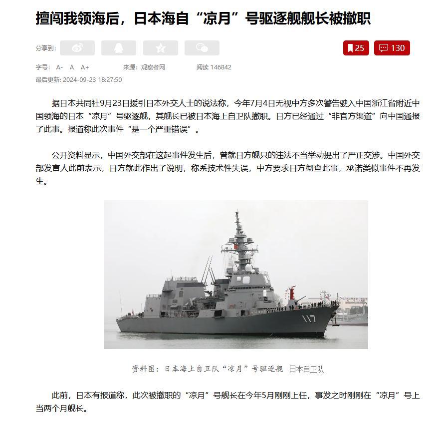 另外还有一丝,算上这次危机在内,这仍是是比年改日本自保队在涉华问题上的第二次“独走”了。上一次是2024年7月,日本海上自保队的“凉月”号驱逐舰在未经陈诉的情况下,无视中方屡次告诫,强闯浙江省近邻的中国领海。