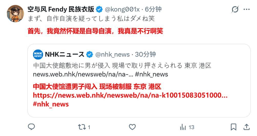 我出这期节方针时间是3月24日的傍晚。我去日本各大主流媒体上瞅了一眼,果然如斯,绝大大宗王人在装死。只须NHK等少量数日媒实时报谈了这则新闻,并在揣测报谈中提到,犯法嫌疑东谈主是陆上自保队的现役军官,何况还在强闯中国大使馆时佩戴了顾问刀具。