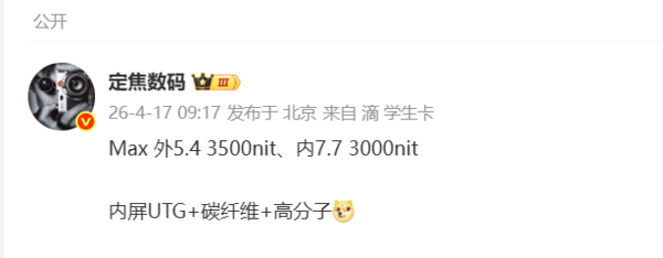 【CNMO科技音书】4月17日,博主“定焦数码”在其酬酢平台进一步裸露了华为Pura X Max的中枢屏幕参数。据最新爆料,该机展望将配备一块亮度高达3500尼特的5.4英寸外屏和一块7.7英寸3000尼特的内屏。其中,内屏可能采选UTG(超薄柔性玻璃)+碳纤维+高分子复合材料的三重驻防结构,有望大幅晋升屏幕的平整度、抗冲击性与耐用性。