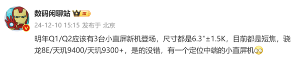 把柄该博主的说法,在来岁的一季度和二季度,将会有3台小直屏新机登场,屏幕尺寸皆是在6.3英寸傍边,屏幕分辨率也皆是1.5K。新机在解决器聘请上有两台定位旗舰,其中一台搭载最新的骁龙8至尊版移动平台,还有一台搭载相似是旗舰芯的天玑9400。不外还有一台定位为中端小直屏,采纳上代的天玑9300+。而在指纹识别方面,三台新机皆将使用短焦指纹,而不是时卑劣行的超声波屏下指纹。不外接头到三款机型均是小屏手机,使用短焦指纹在体验上不会有太大的影响。